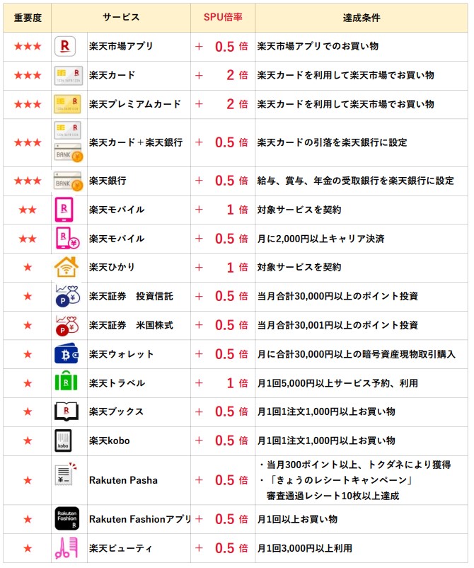 - SPUアップには「楽天市場アプリ」「楽天カード」「楽天銀行」は必須!